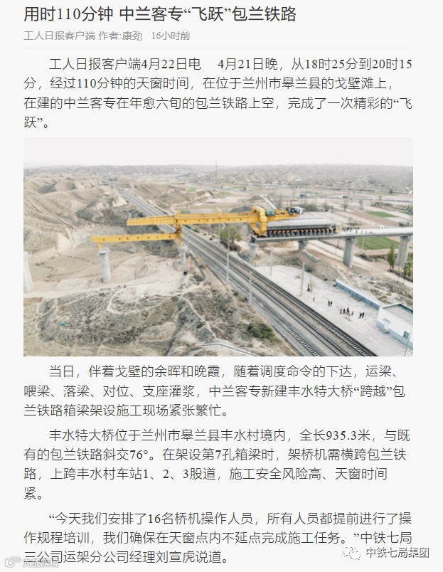 工人日报客户端 4月22日电 4月21日晚,从18时25分到20时15分,经过110分钟的天窗时间,在位于兰州市皋兰县的戈壁滩上,在建的中兰客专在年愈六旬的包兰铁路上空,完成了一次精彩的“飞跃”。