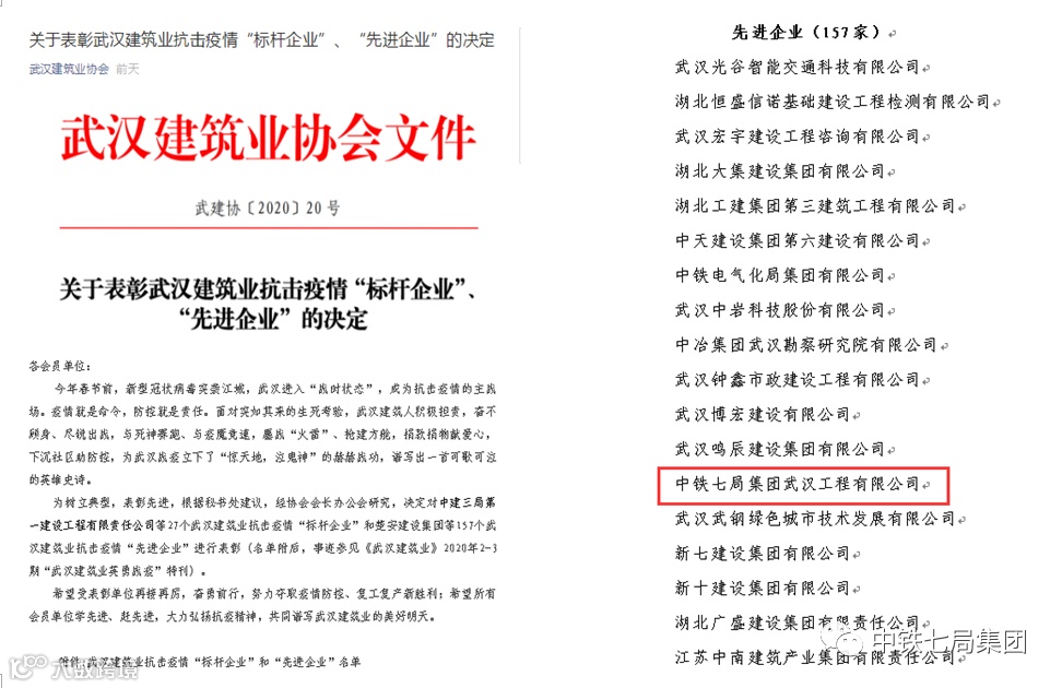 4月14日,从武汉建筑业协会获悉,中铁七局武汉公司荣获抗击疫情“先进单位”称号。今年春节,新冠肺炎疫情席卷武汉,作为中央企业在汉单位,中铁七局武汉公司主动向武汉市政府递交请战书,并积极组织基层单位多次援建“方舱医院”建设,参与武汉三环线除冰扫雪打通疫情救援通道行动,并发动近700名党员及干部职工开展自愿捐款,共计筹集款项15万余元。疫情期间,该公司先后有近百名党员、干部职工参与到社区、村镇的卡点执勤、测量体温、送菜消毒、信息统计、疫情宣传等工作中。