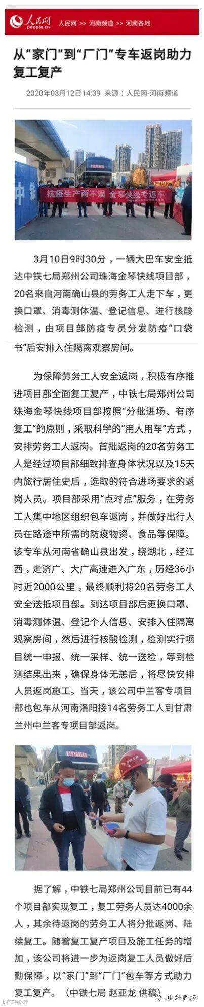 “为了做到疫情防控和项目建设两不误,我们采取了包车接送、核酸检测等多种措施,基本解决了施工人员返岗复工问题,到2月底,所有工点已全部复工复产。”中铁七局总经理师建军介绍,目前,太焦铁路所有施工现场全部施行封闭管理,人员进场要戴口罩、测体温、消毒、登记,办公区、生活区、作业区、餐厅等公共场所每日要进行两次集中消毒,“如期完成建设目标,我们有信心!”