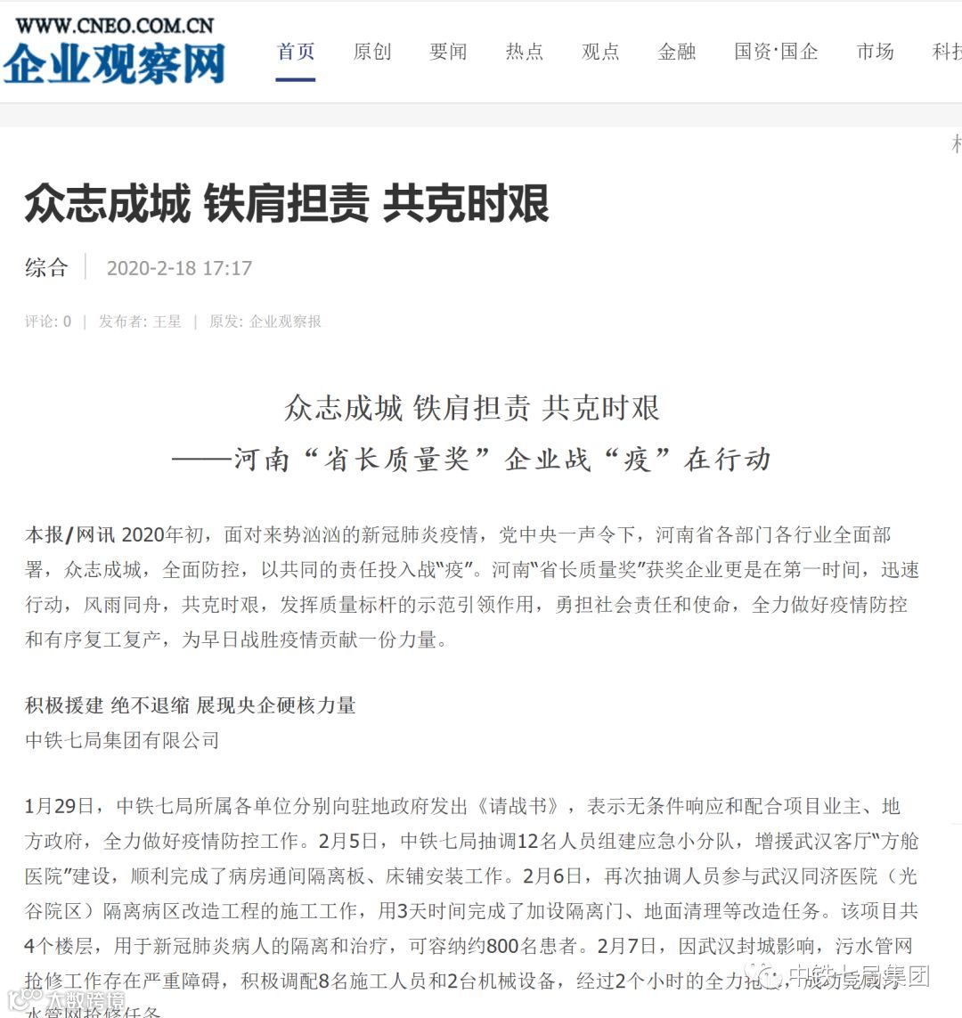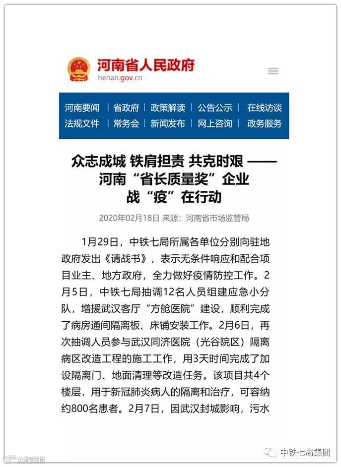 1月29日,中铁七局所属各单位分别向驻地政府发出《请战书》,表示无条件响应和配合项目业主、地方政府,全力做好疫情防控工作。2月5日,中铁七局抽调12名人员组建应急小分队,增援武汉客厅“方舱医院”建设,顺利完成了病房通间隔离板、床铺安装工作。2月6日,再次抽调人员参与武汉同济医院(光谷院区)隔离病区改造工程的施工工作,用3天时间完成了加设隔离门、地面清理等改造任务。该项目共4个楼层,用于新冠肺炎病人的隔离和治疗,可容纳约800名患者。2月7日,因武汉封城影响,污水管网抢修工作存在严重障碍,积极调配8名施工人员和2台机械设备,经过2个小时的全力抢修,成功完成污水管网抢修任务。
