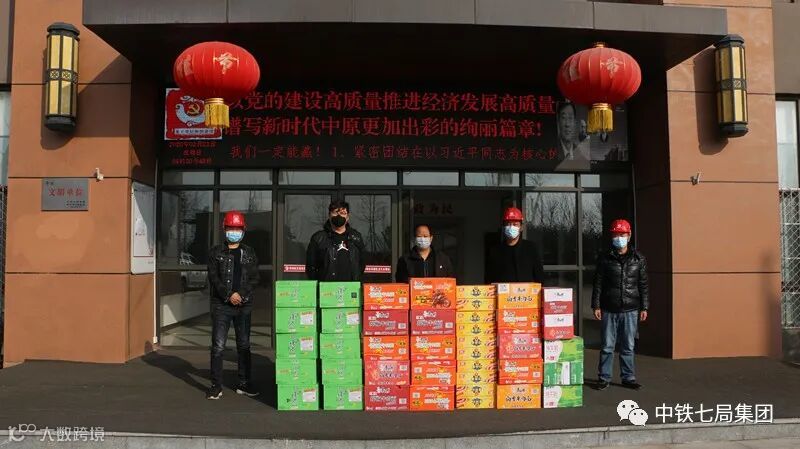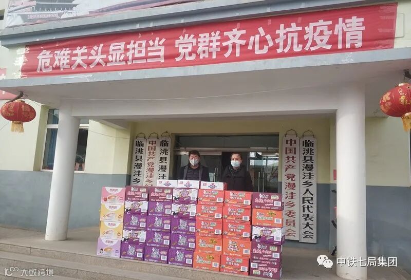 2月21日,中铁七局一公司定临一分部向定西市临洮县漫洼乡政府和渭源县秦祁乡政府捐赠口罩300个,消毒液20升,洗手液12瓶,方便面75箱,火腿肠3箱,奶茶6箱。