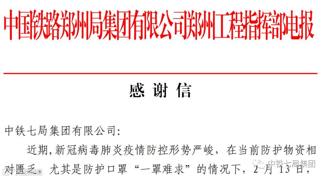 2 月 13 日,中铁七局郑州公司在当前防护物资相对匮乏,尤其是口罩“一罩难求”的情况下,安排员工为郑州局集团公司郑州工程指挥部送去了口罩 2000 个,解决了指挥部的实际困难,为指挥部持续做好疫情防控工作提供了物资保障。为此,该指挥部在2月14日特发来感谢信。