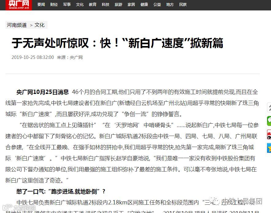 “在锯齿状的施工点上见缝插针”“在‘天罗地网’中啃硬骨头”……说起新白广,中铁七局每一位参建者的心中都留下了刻骨铭心的记忆。新白广城际轨道2标段由中铁一局、四局、七局、八局、广州局联合参建,“在全线开工最晚、在强手如林的拼抢中,我们用超乎寻常的快,抢先第一家完成,刷新了珠三角城际‘新白广速度’。”中铁七局新白广指挥长赵学自豪地说,“我们是唯一一家没有收到中铁股份集团有限公司下督办通知的单位,我们用最强的施工组织弥补了最差的施工条件。可以毫不夸张地说,中铁七局在新白广这里创造了奇迹。”