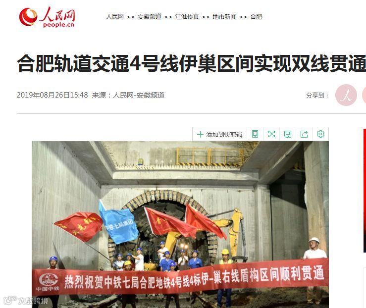 【新华网&人民网】合肥轨道交通4号线伊巢区间实现双线贯通