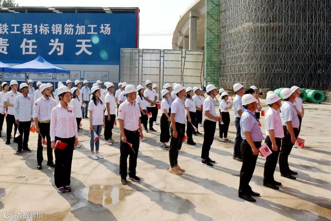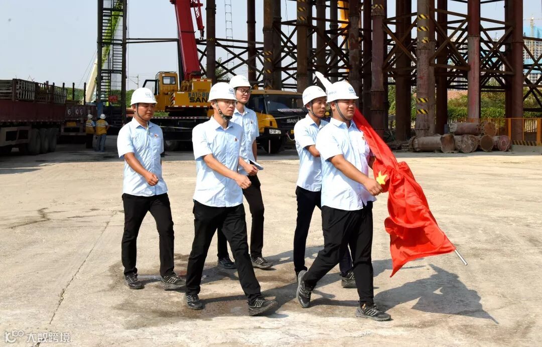 升旗仪式在郑州公司北四环项目大河路转体施工现场举行,由项目青年组成的升旗方阵迈着整齐划一、铿锵有力的步伐,昂首阔步护卫着国旗走上升旗台。全体团员青年挺拔肃立,向国旗行注目礼,在庄严的国歌声中,五星红旗冉冉升起,迎风飘扬。