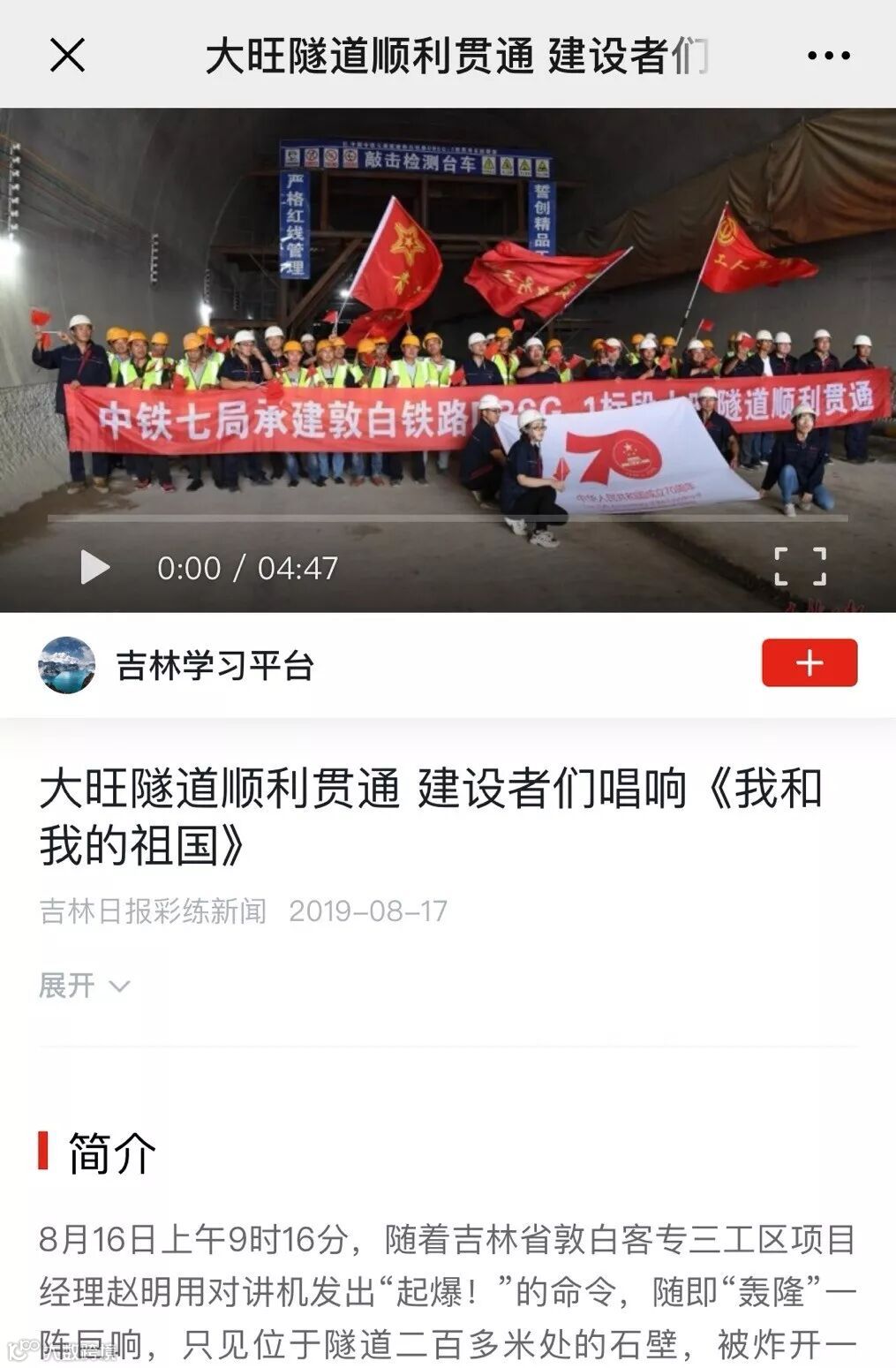 8月16日上午9时16分,随着吉林省敦白客专三工区项目经理赵明用对讲机发出“起爆!”的命令,随即“轰隆”一阵巨响,只见位于隧道二百多米处的石壁,被炸开一片,瞬间对面的光线洒进来,工人们激动地欢呼,与对面的工友们拥抱“会师”,百余名建设者激动地挥舞着手中的国旗,为庆祝大旺隧道的成功贯通,共同唱起了《我和我的祖国》“我爱我的祖国,一刻也不能停留……”这歌声从隧道飞出,直冲天际。