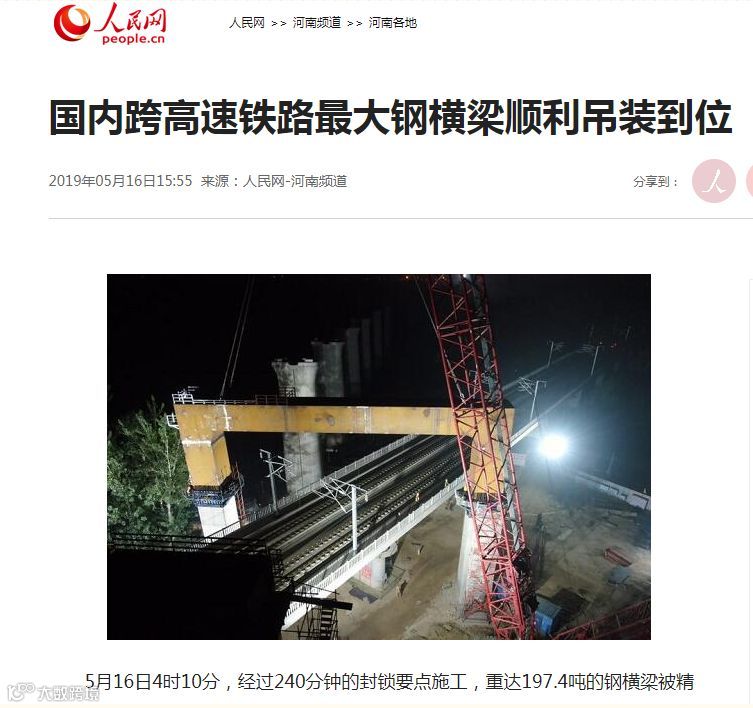 5月16日4时10分,经过240分钟的封锁要点施工,重达197.4吨的钢横梁被精准放置在24.5米高的门式墩上。