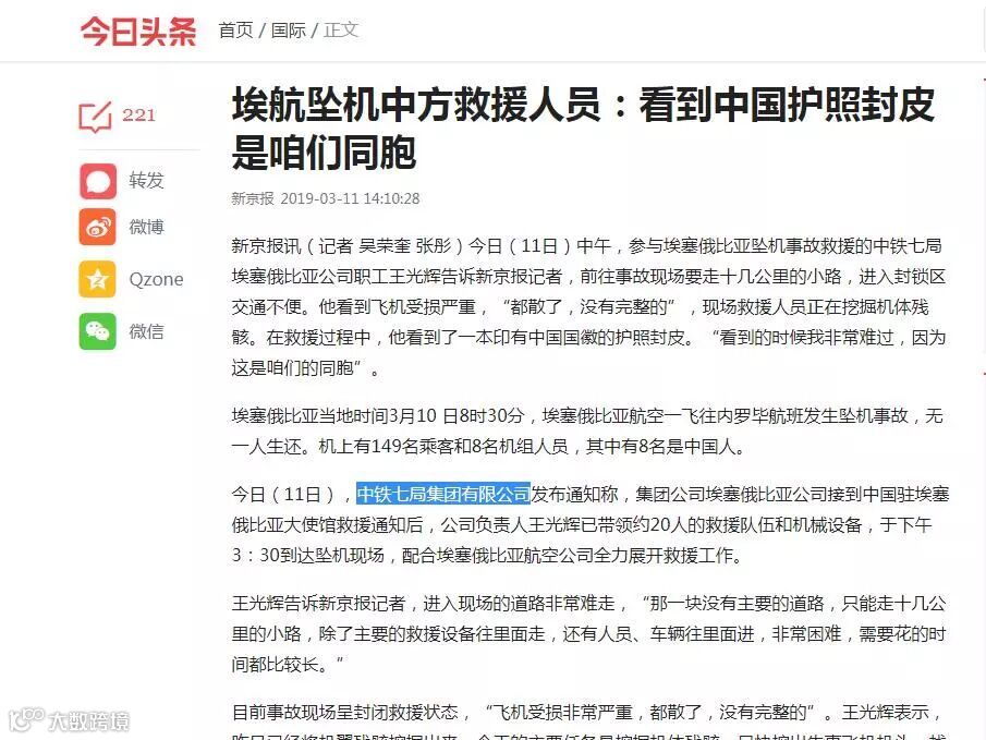 埃塞俄比亚当地时间3月10日8时30分,埃塞俄比亚一架客机在该国比绍夫图镇(Bishoftu)附近坠毁,机上有8名中国人。中铁七局埃塞俄比亚公司接到中国驻埃塞俄比亚大使馆救援通知后,公司负责人王光辉立即带领约20人的救援队伍和机械设备,于下午3:30到达坠机现场,配合埃塞俄比亚航空公司全力展开救援工作。