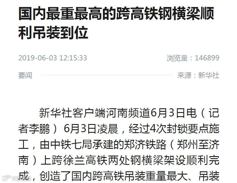 6月3日凌晨,经过4次封锁要点施工,由中铁七局承建的郑济铁路(郑州至济南)上跨徐兰高铁两处钢横梁架设顺利完成,创造了国内跨高铁吊装重量最大、吊装高度最高的新记录。