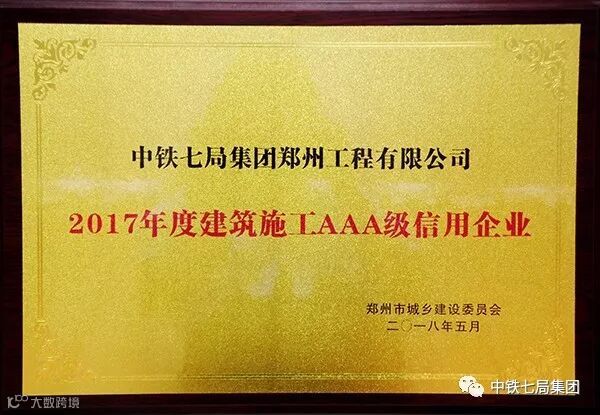 7月24日,中铁七局郑州公司从郑州市城乡建设委员会处收到“2017年度建筑业施工AAA级信用企业”奖牌,该荣誉是郑州市建委第一次设立的奖项,是对中铁七局郑州公司综合实力以及总体工作的认可。据悉,根据企业信用评价的结果,AAA级企业在参加政府采购、国有投资项目招投标等事项中享有优先权;在各类创优评先中享有优先权;优先列入政府投资项目预选承包商名库录等方面享有差别化管理。