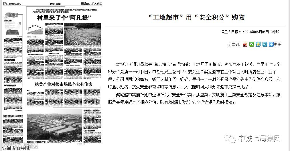 工地开了间超市,买东西不用花钱,而是用“安全积分”兑换——6月1日,中铁七局三公司“平安先生”奖励超市在三个项目同时揭牌营业。据了解,公司项目部给每名一线工人制作了二维码,手机扫一扫就能登录“平安先生”微信公众号,实时显示姓名、接受安全教育课时等信息,工人们随时可凭积分来超市兑换日用品。