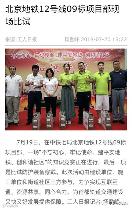 7月19日,在中铁七局北京地铁12号线09标项目部,一场“不忘初心、牢记使命、建平安地铁、创和谐社区”的知识竞赛正在进行,最后一项是比试防护装备穿戴。此次活动由建设单位、施工单位和街道社区三方参与,力争实现互联互通、资源共享,同心合力,为首都轨道交通建设又快又好发展提供保障。