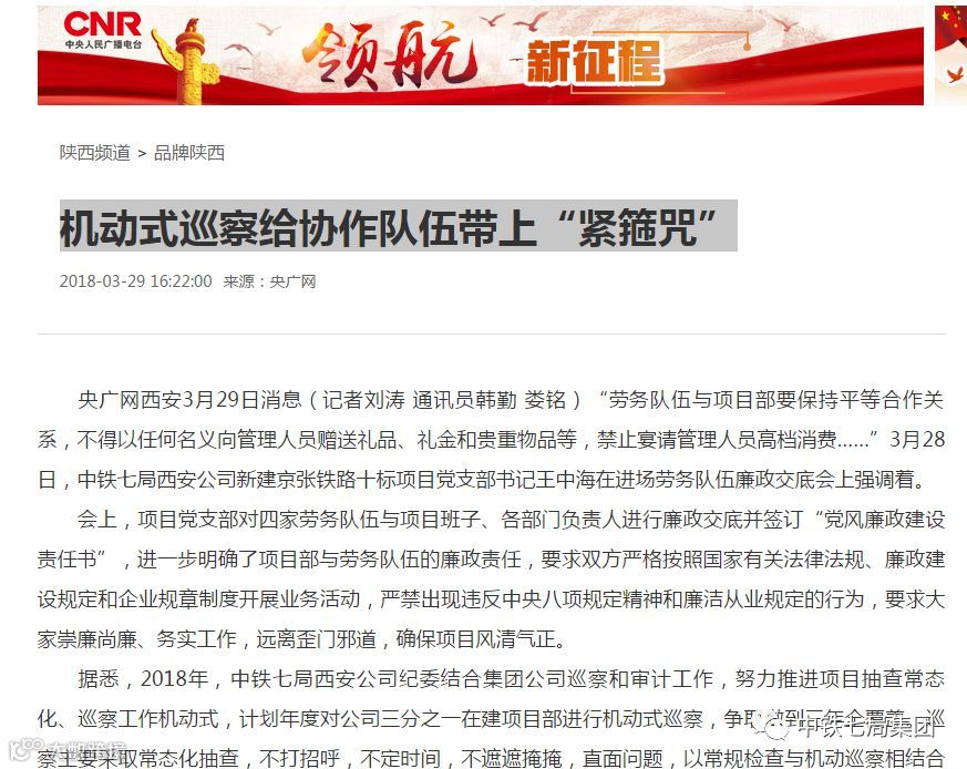 中铁七局西安公司纪委积极探索推行机动式巡察,在劳务队伍中形成有力震慑,要求各单位党组织对新进场劳务队伍必须进行廉政交底,不仅明确双方廉政责任,更为项目管理人员拉起了廉洁“警戒线”,真正让廉洁纪律的“紧箍咒”越扎越紧、越扎越严,确保深入持久推进全面从严治党在基层项目落地生根、看见成效。