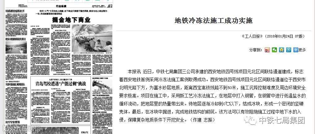 近日,中铁七局集团三公司承建的西安地铁四号线项目元北区间联络通道建成,标志着西安地铁首例采用冷冻法施工案例取得成功。西安地铁四号线项目元北区间联络通道位于西安市北明光路下方,为富水砂层地质,距离西宝高铁线路不到50米,施工沉降控制难度及周边环境安全要求极高。项目在施工中,采用新工艺冷冻法施工,在地层中打入钢管,在钢管中进行低温盐水的循环流动,把地层里的热量带出来。待地层逐渐冷却到0℃以下,结成冰块,形成一个密闭的坚硬壳体。最后,在冰块中掘进,完成地铁结构的砌筑。该方法可以有效阻绝施工过程中地下水的入侵,保障复杂地质条件下开挖安全。