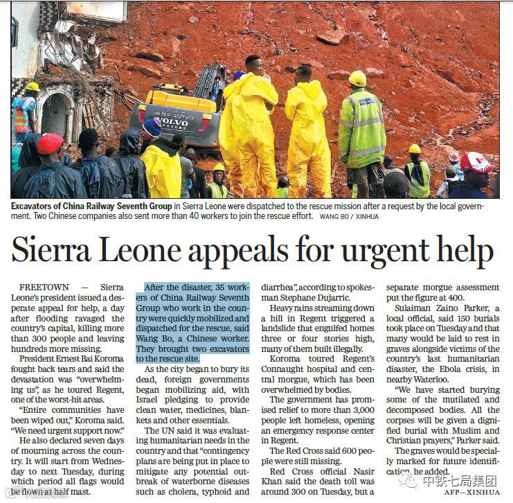 8月15日,就中铁七局积极参与塞拉利昂洪水泥石流特大灾害救援一事,新华社再发通稿,中国日报也在头版大篇幅报道此事。在危难时刻,中铁七局用自己的行动再次树立了国威,彰显国企担当!