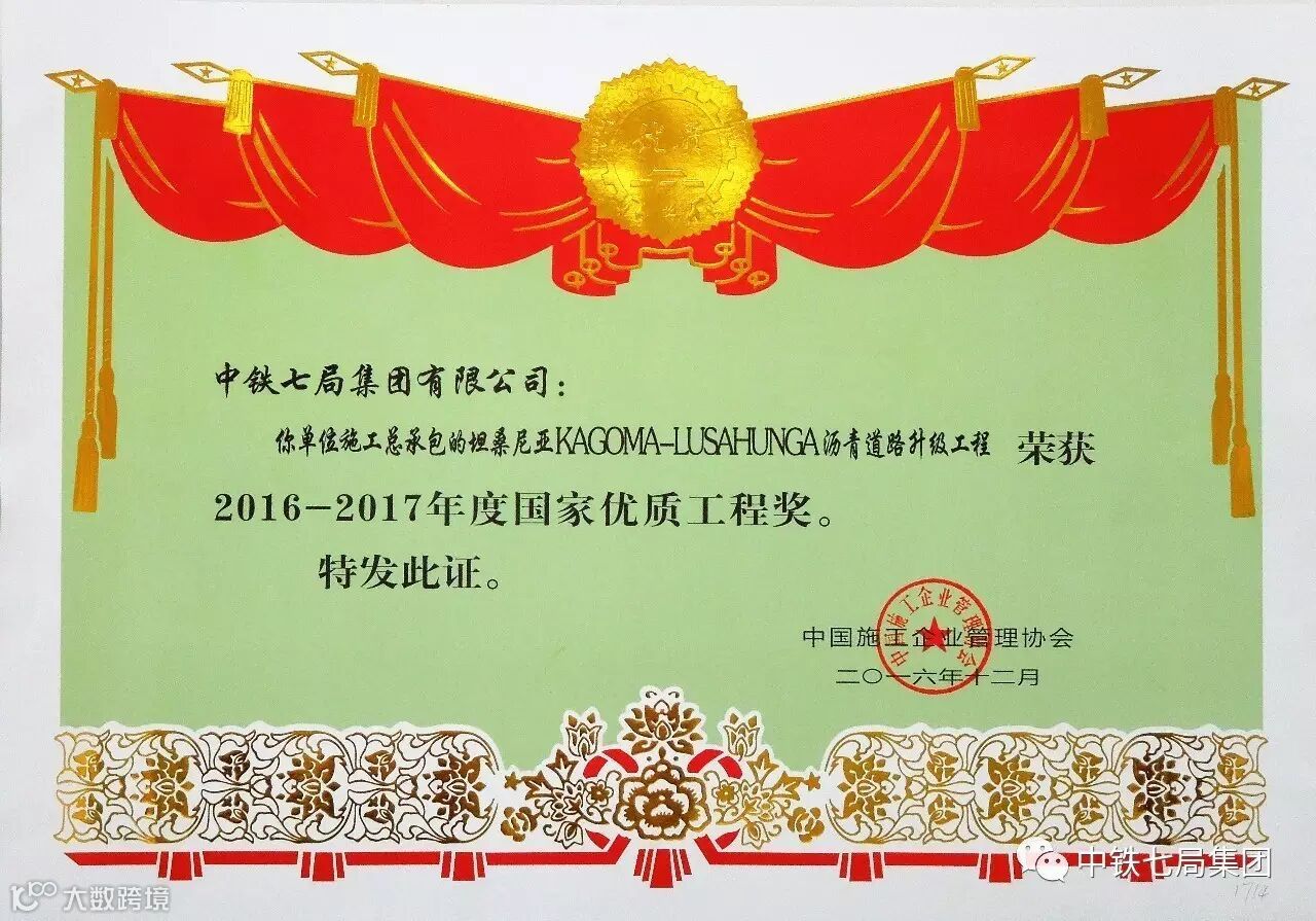 日前,中国施工企业管理协会2016-2017年度第一批国家优质工程奖评选揭晓。中铁七局承建的埃塞俄比亚118公里道路项目、坦桑尼亚KAGOMA-LUSAHUNGA沥青道路升级工程、南京至高淳城际轨道南京南站至禄口机场段工程等3项工程榜上有名。其中,上述两项海外工程属中铁七局海外项目首次获得国家优质工程奖,填补了海外领域的空白,为中铁七局积极开拓海外市场提供了有力支撑。截至2016年,中铁七局共获得国家级优质工程奖26项,省部级优质工程奖63项,中国中铁杯优质工程奖13项,中国中铁优质工程奖36项。