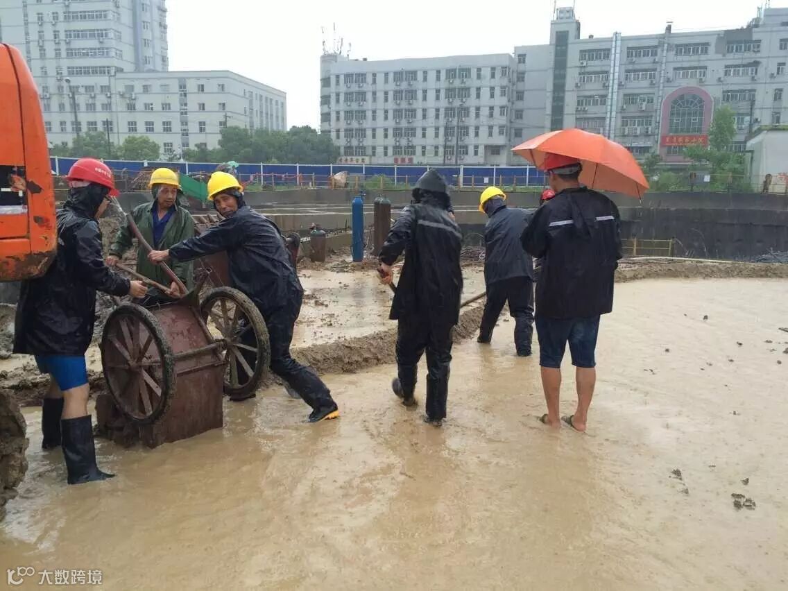 7月6日,中铁七局三公司武汉地铁项目遭遇特大暴雨灾害,图为当日上午9点,工地左侧顶板附近,项目管理人员组成的突击抢险队正在排水。