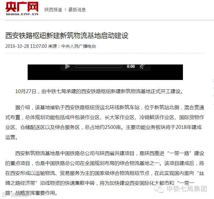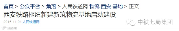 10月27日,由中铁七局承建的西安铁路枢纽新建新筑物流基地正式开工建设。该项目建成后,将在西安形成以运输物流、贸易服务为主的国家级综合物流枢纽节点,在此实现国内面向“丝绸之路经济带”沿线物资的快速集散中转,将为加快建设西安国际化大都市和“一带一路”战略发挥重要作用。新华网、中央人民广播电台、工人日报、人民铁道、陕西日报、陕西工人报、西安日报、华商报等各级媒体对此进行了报道。