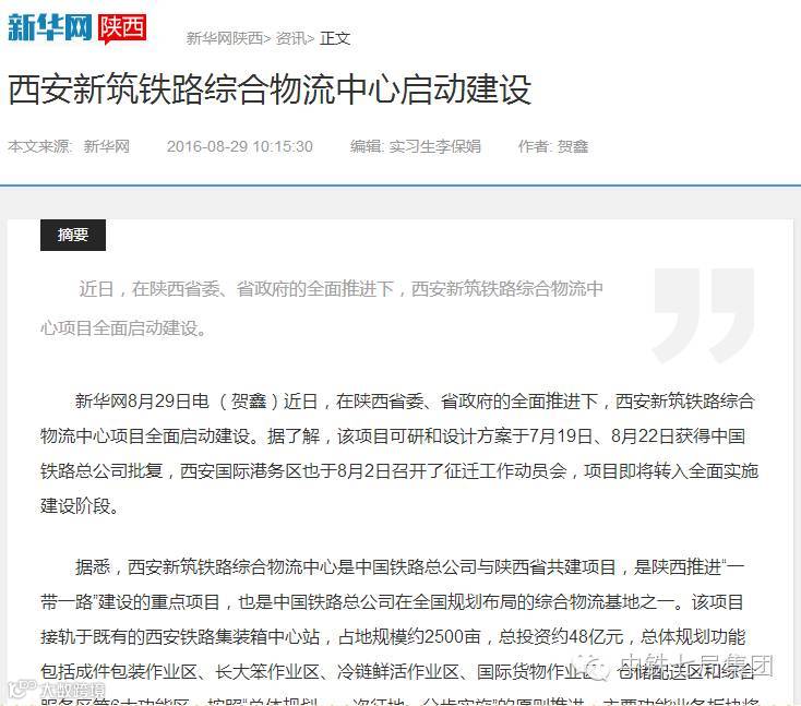 近日,在陕西省委、省政府的全面推进下,西安新筑铁路综合物流中心项目全面启动建设。据了解,该项目可研和设计方案于7月19日、8月22日获得中国铁路总公司批复,西安国际港务区也于8月2日召开了征迁工作动员会,项目即将转入全面实施建设阶段。