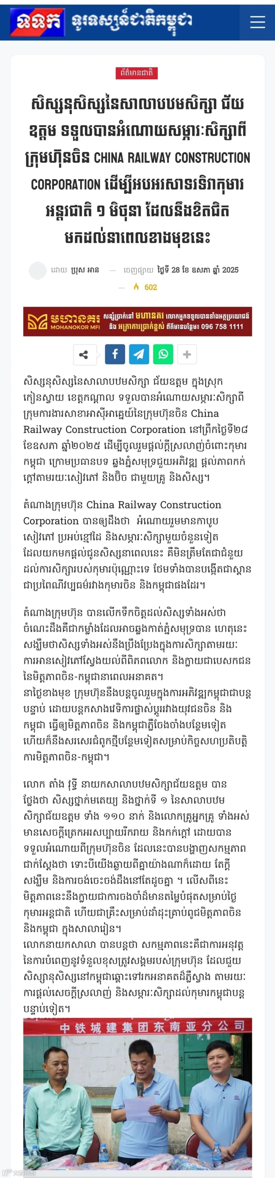 未来,中铁城建集团东南亚分公司将继续以多元形式参与柬埔寨公共事业发展,持续搭建中柬青少年交流平台,让“跨越山海”的情谊在更多领域绽放光彩,为中柬友好合作续写新的篇章。(刘宇松 张军)