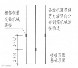 2)接长竖向钢筋,剪力墙同排内相邻两根竖向筋接头应相互错开,不同排相邻两根竖向钢筋接头也应相互错开。搭接接头错开500mm,机械连接接头错开35d。注意搭接接头的长度除应满1.2锚固长度外,还应满足搭接范围内通过三根水平筋。