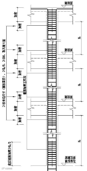 4)柱的端部要进行加密。柱加密区长度应取柱截面长边尺寸(或圆形截面直径)、柱净高的1/6和500mm中的最大值,当有刚性地面时,除柱端箍筋加密区外尚应在刚性地面上、下各500mm的高度范围内加密。【注:最底层(一层)柱子的根部应取不小于1/3的该层柱净高】