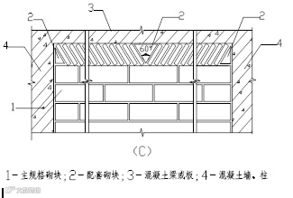 3)外墙转角处及纵横墙交接处,应将砌块分皮咬搓,交错搭砌,砌体砌至门窗洞口边非整块时,应用同品种的砌块加工切割成。不得用其它砌块或砖镶砌。