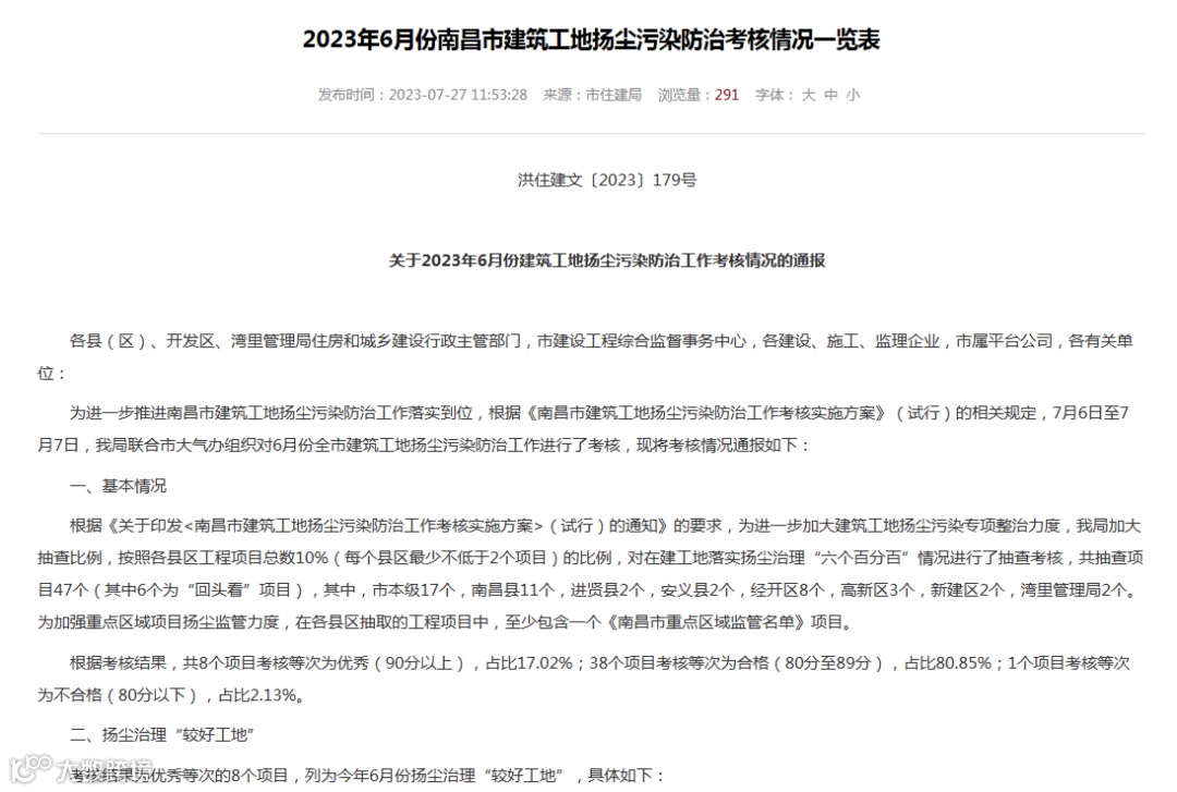为扎实落实上级环保工作要求,切实做好项目扬尘治理工作,让绿色成为企业高质量发展的鲜明底色,近日,南昌市住房和城乡建设局联合市大气办对全市在建工地落实扬尘治理“六个百分百”情况进行了抽查考核,根据考核结果,共8个项目考核等次为优秀(90分以上),占比17.02%,公司第九项目部南昌京川村安置房项目榜上有名,考核为优秀等次,并被评为2023年6月扬尘治理“较好工地”。