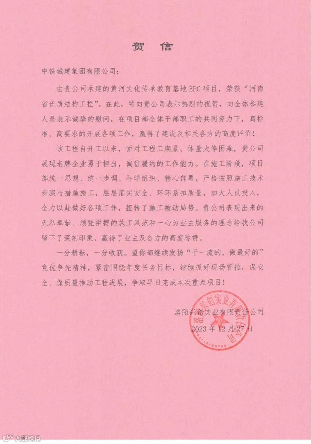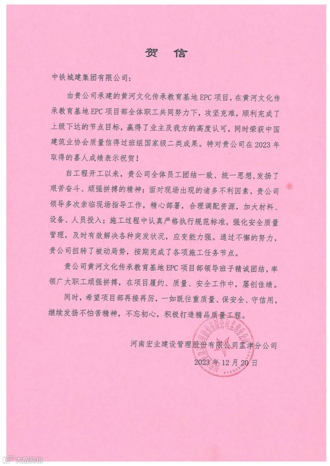 信中表示,在黄河文化传承教育基地项目全体职工共同努力下,攻坚克难,顺利完成了上级下达的节点目标,同时荣获中国建筑业协会质量信得过班组国家级二类成果。