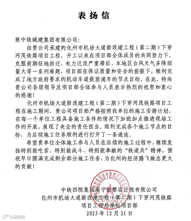 近期,公司化州机场大道新改建工程(第二期)下穿河茂铁路项目收到业主单位表扬信,信中指出,自项目开工以来,在项目部全体成员的共同努力下,克服一系列难题,顺利完成节点目标展现了央企的责任与担当。