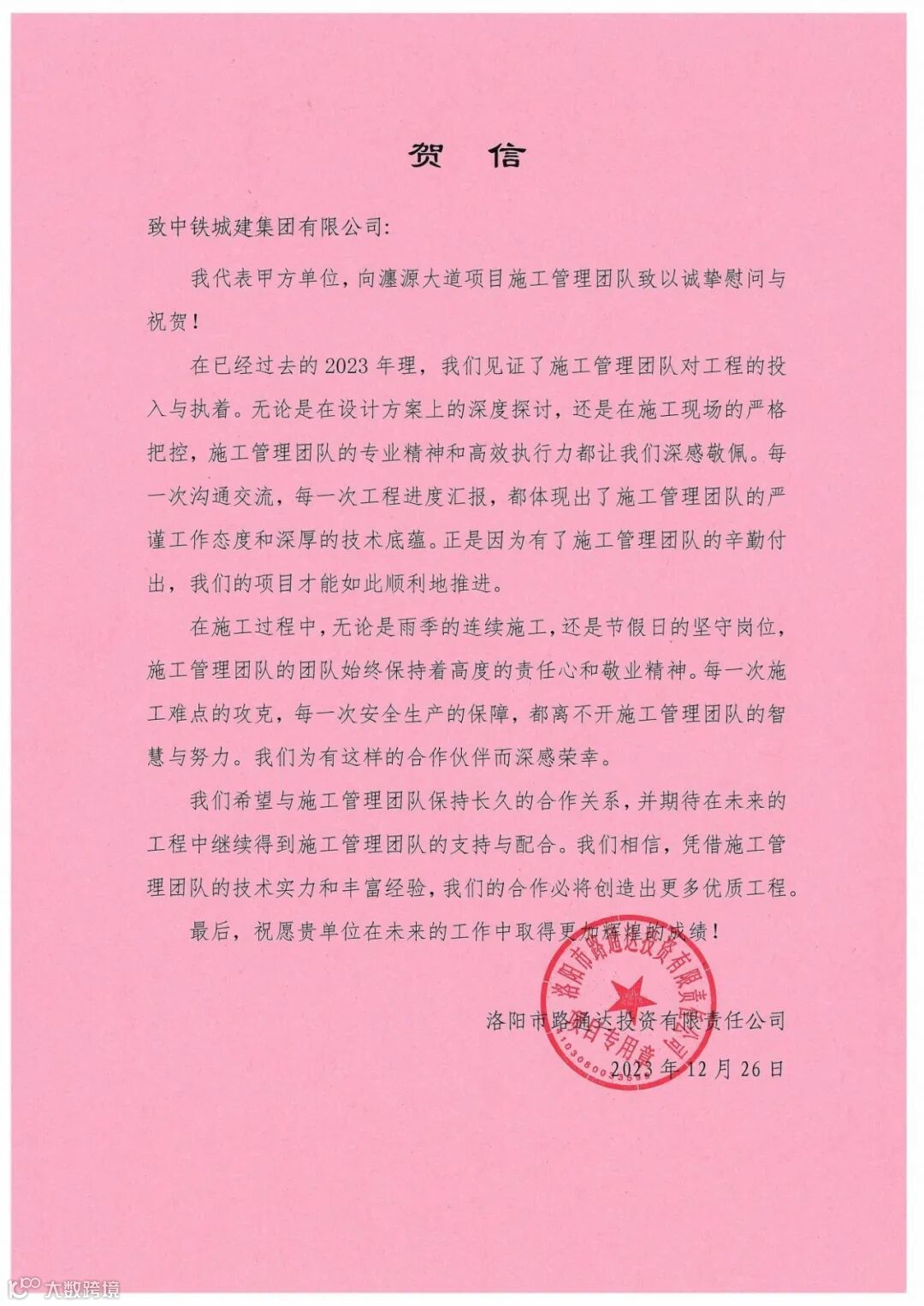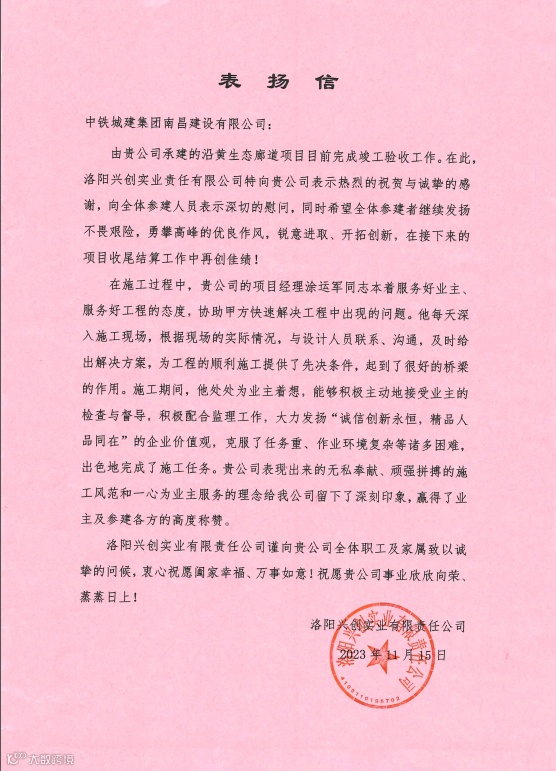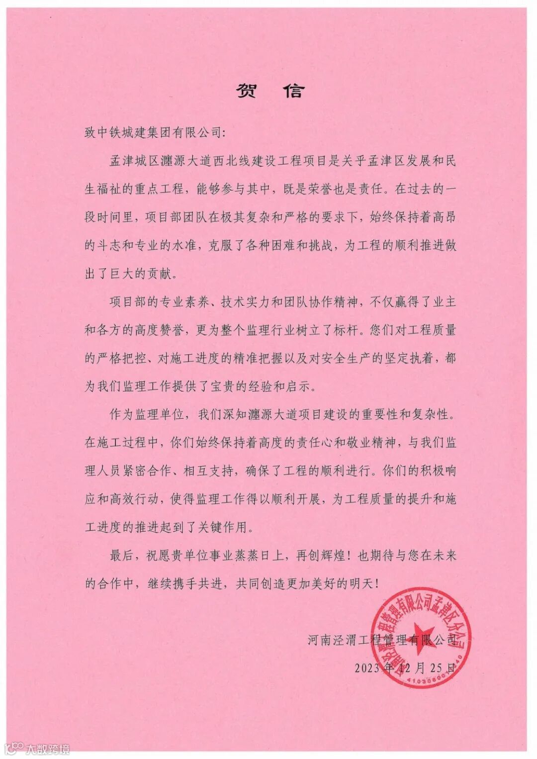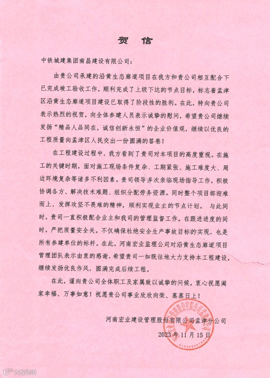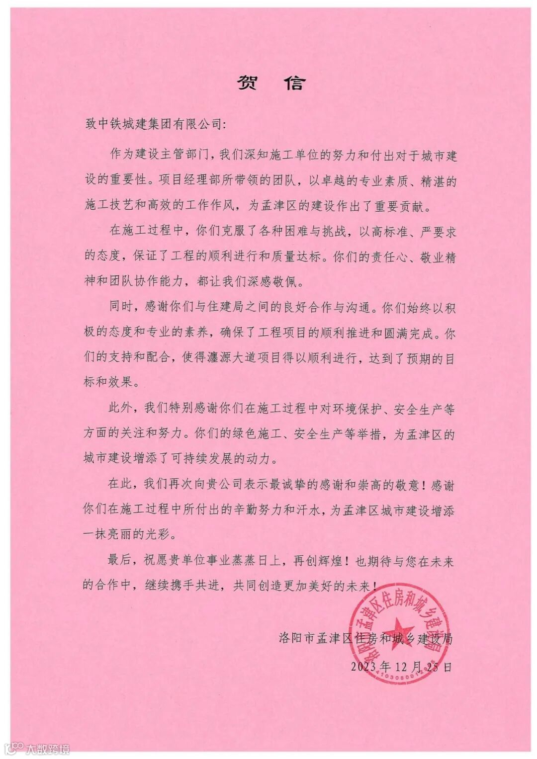 信中表示,项目团队以卓越的专业素质、精湛的施工技艺和高效的工作作风,为孟津区的建设作出了重要贡献。在施工过程中,项目团队克服了各种困难与挑战,以高标准、严要求的态度,保证了工程的顺利进行和质量达标,达到了预期的目标和效果,环境保护、安全生产、绿色施工等举措,为孟津区的城市建设增添了可持续发展的动力。