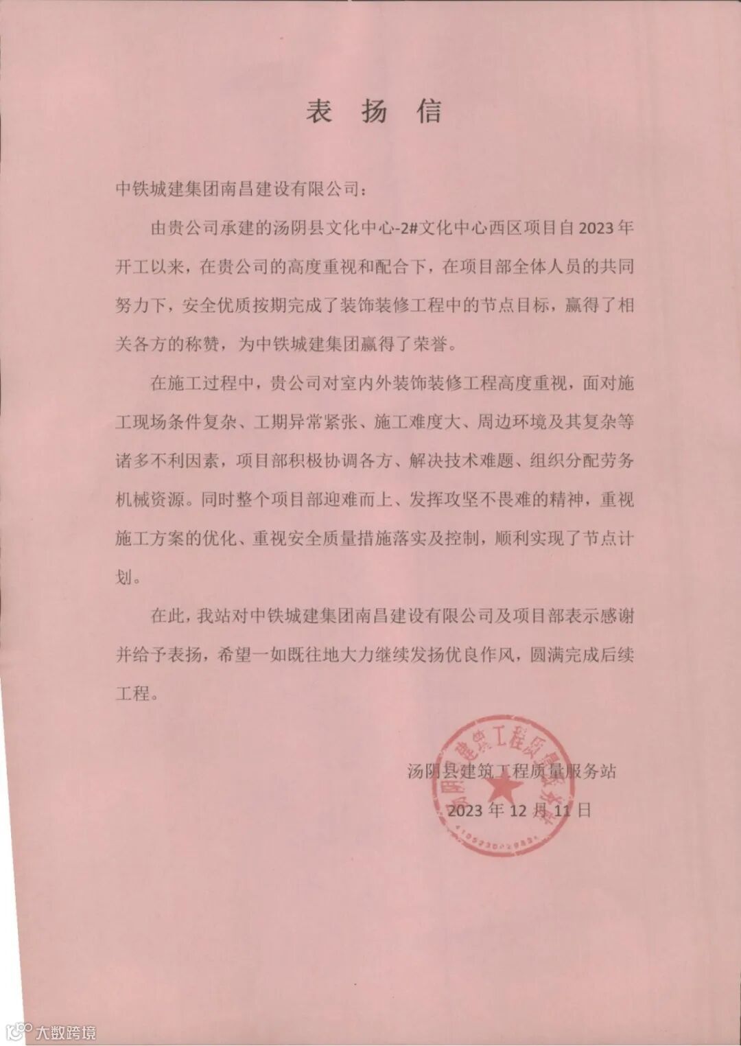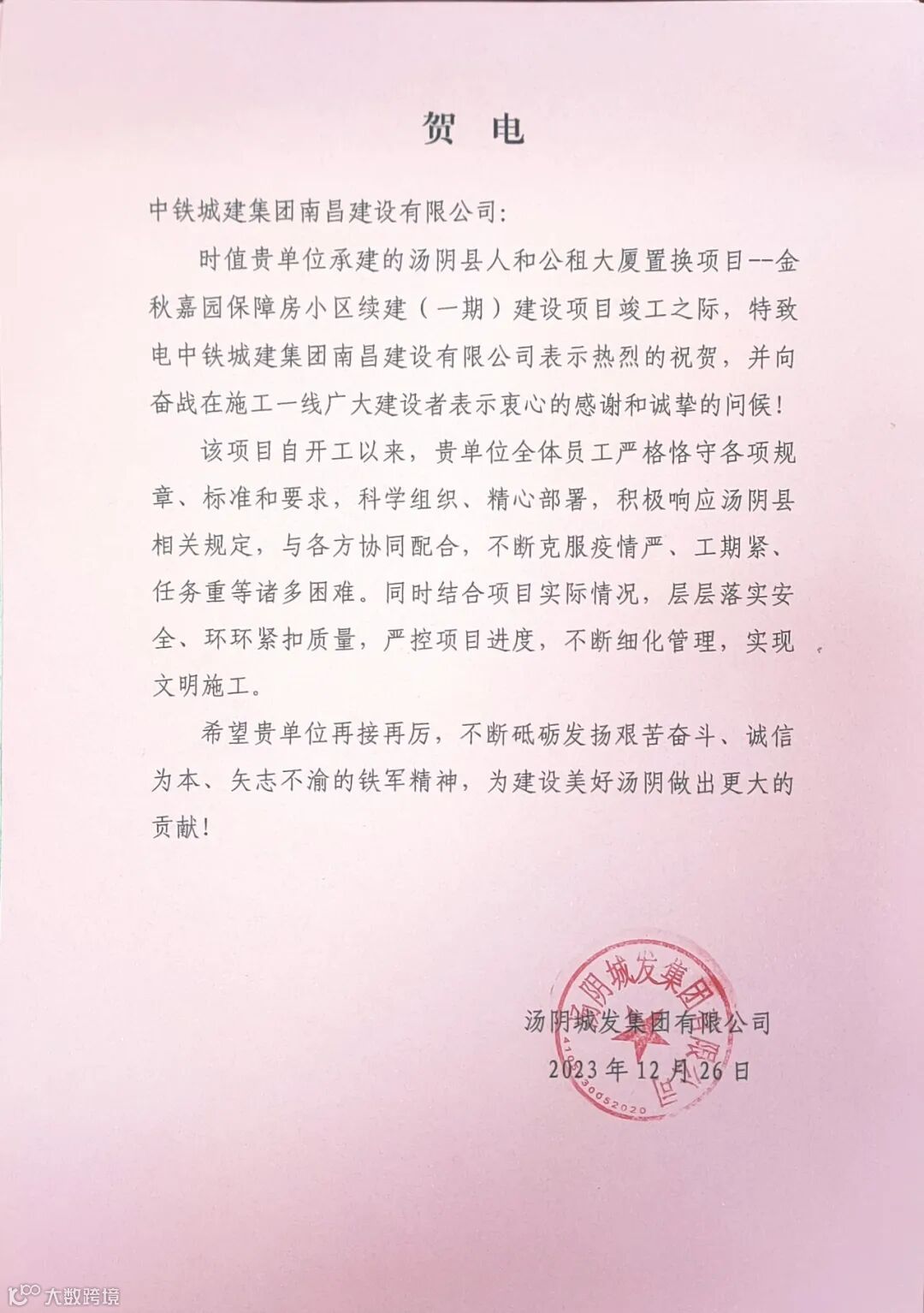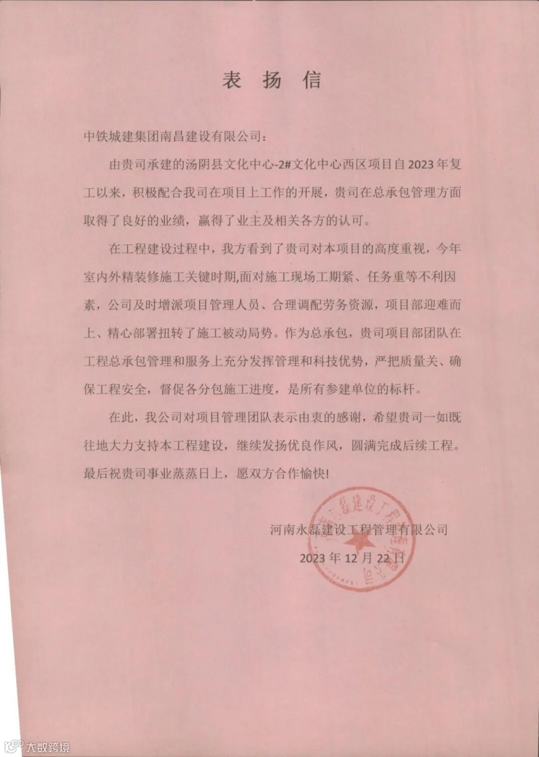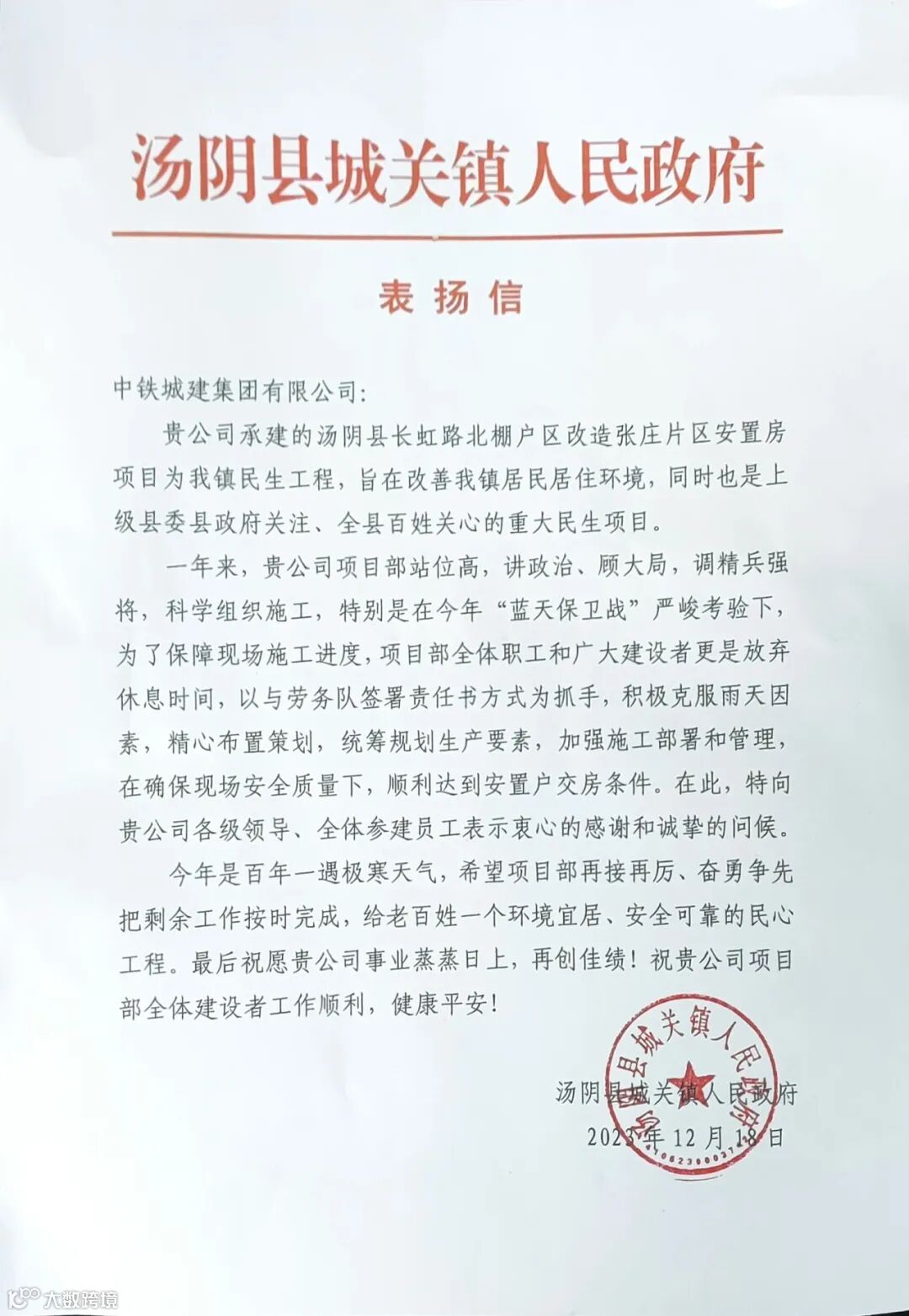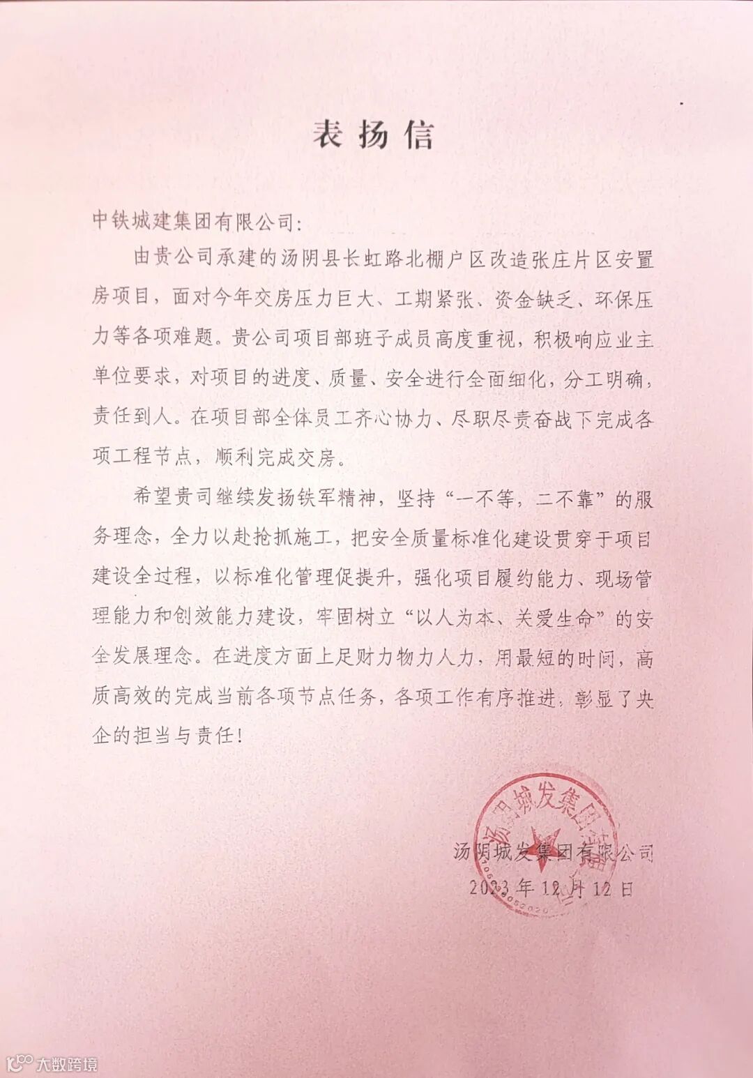 汤阴县人才公寓项目收到业主及监理单位表扬信,信中表示,该项目自开工以来,全体员工严格恪守各项规章、标准和要求,科学组织、精心部署,积极响应汤阴县相关规定,与各方协同配合,不断克服疫情严、工期紧、任务重等诸多困难,顺利实现了竣工验收。