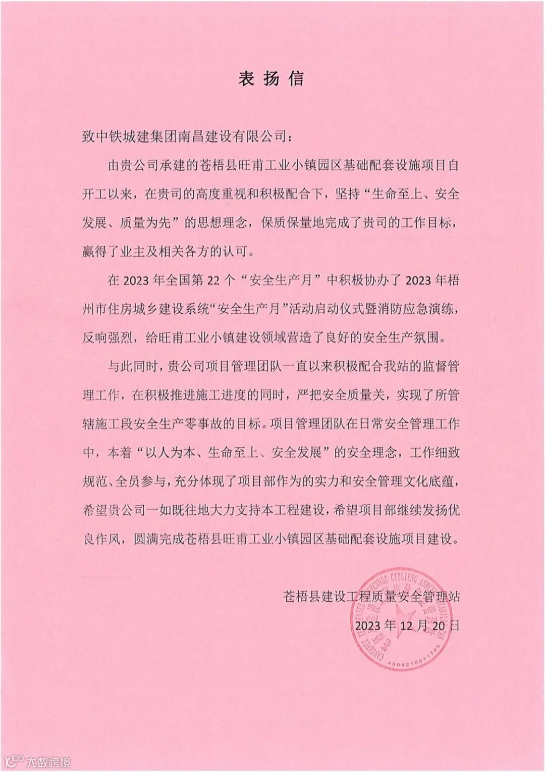 信中表示,苍梧旺甫工业小镇项目自开工以来,在全体参建人员的高度重视和精细管理下,项目管理团队秉承创新进取的工作态度,积极参与到旺甫工业小镇的建设中。以项目经理为主的项目管理团队靠前指挥,精密部署,合理调配资源。在建设过程中,积极运用建筑施工十大新技术,打造了诸多亮点。先后荣获“梧州市建设文明工地”、“广西建设工程优质结构奖”、“广西建筑业绿色施工示范工程"等,给梧州市项目施工建设树立了良好的榜样。