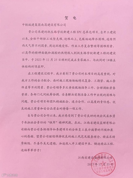 公司南昌属地抚生路学校项目收到监理单位表扬信,信中对该项目全体职工攻坚克难,迎难而上,以高昂的精神面貌和满腔的热情投入到项目建设中,顺利冲出正负零表示祝贺。