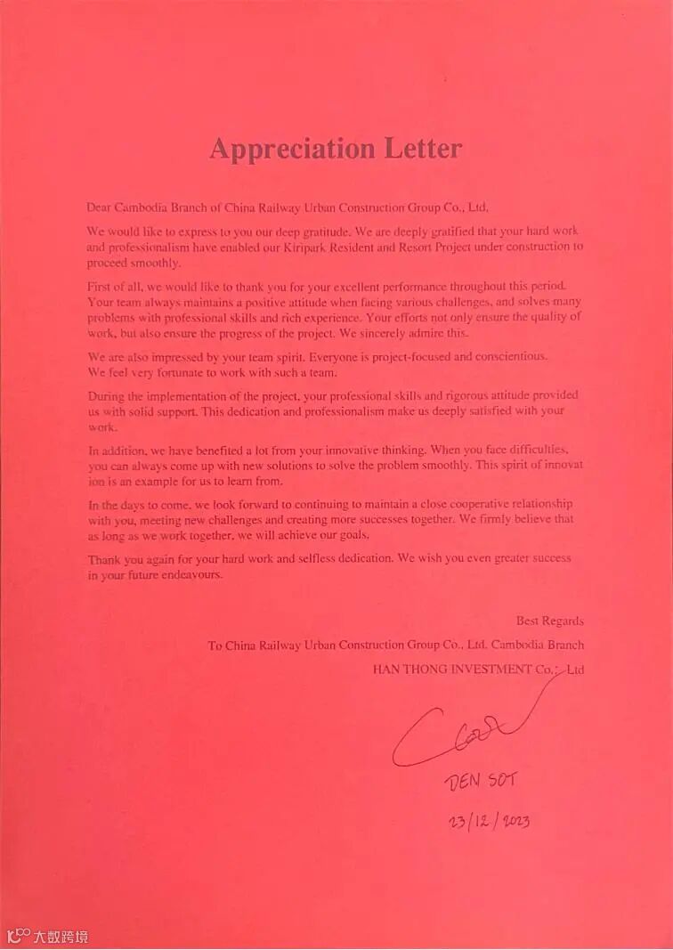 公司柬埔寨吉利度假山庄项目荣获业主单位表扬信,表扬信中,业主对项目部保质保量完成各工程施工节点目标给予高度评价与充分肯定。对项目部能够科学统筹组织施工建设,全力克服各种问题,项目全体人员上下一心,顽强拼搏表示认可与感谢。