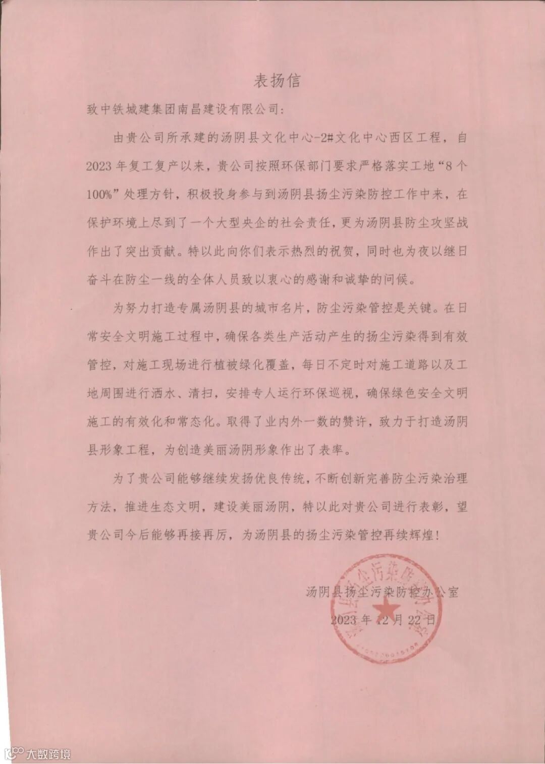 近期,公司汤阴县文化中心项目获得地方安监站、质监站、扬尘办、业主和监理单位表扬信。