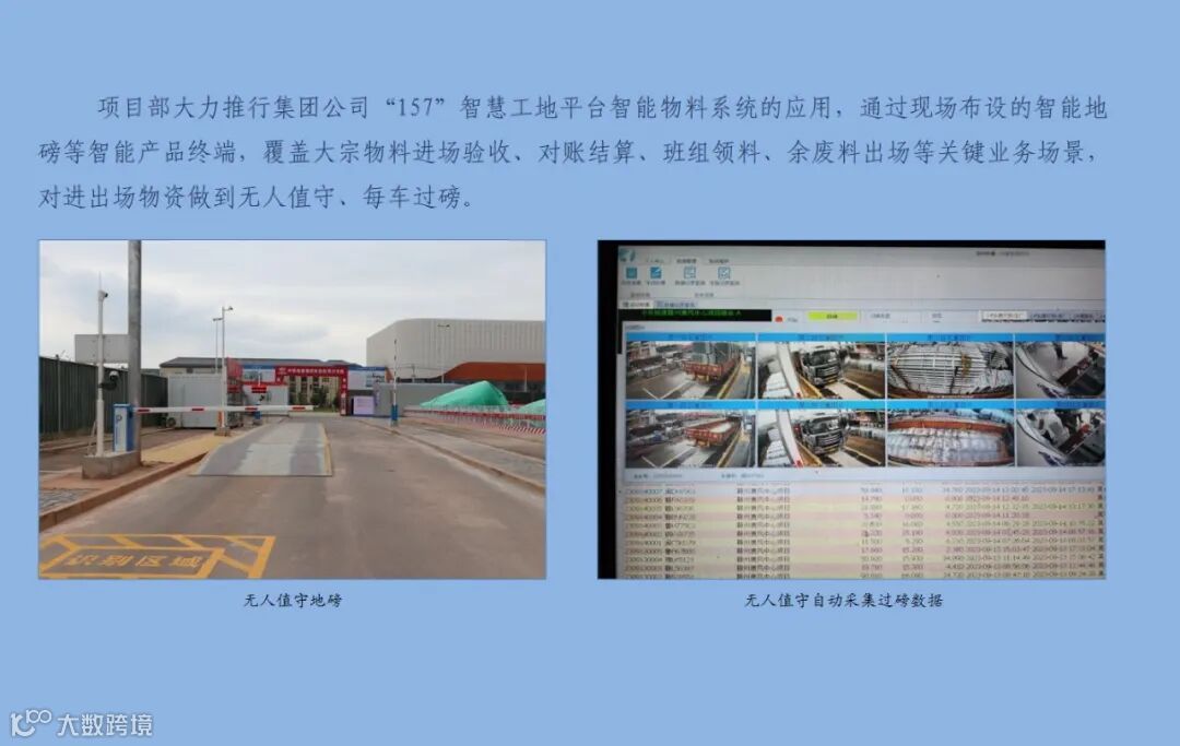 项目部大力推行集团公司“157”智慧工地平台智能物料系统的应用,通过现场布设的智能地磅等智能产品终端,覆盖大宗物料进场验收、对账结算、班组领料、余废料出场等关键业务场景,实现对大宗物资的量化管理,及时化解管理风险,提高了作业效率。