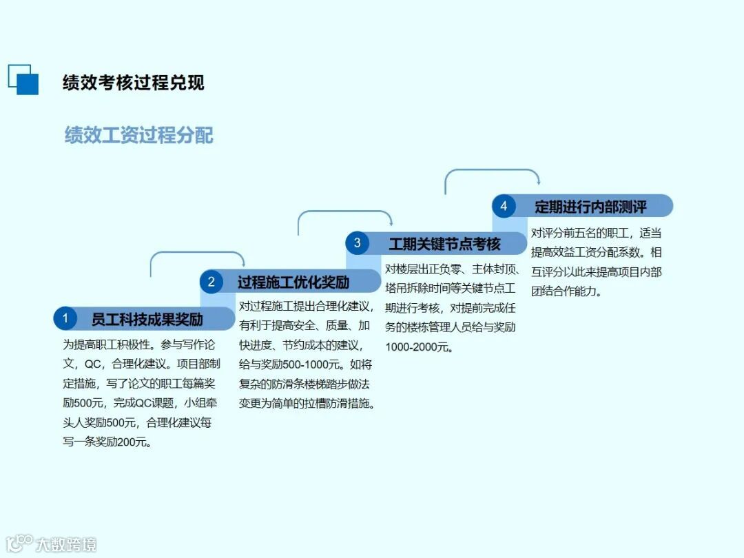 效益工资过程分配。每半年考核的效益工资结合职工日常表现,内部测评分数,变更索赔,科研方面等确定分配金额。经项目责任成本领导小组讨论分配金额后报公司审批。效益工资分配时,优先考虑项目日常考核内容。