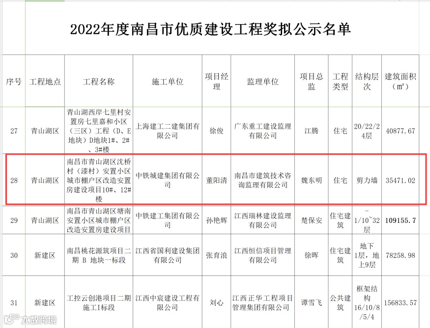近日,江西省南昌市住建局公布了2022年度南昌市优质建设工程奖工程名单,由公司承建的青山湖沈桥安置房项目荣登该名单。截至目前,该项目已荣获南昌市质量标准化工地,南昌市建设工程奖,南昌市安全文明工地,江西省安全文明工地等多个奖项。