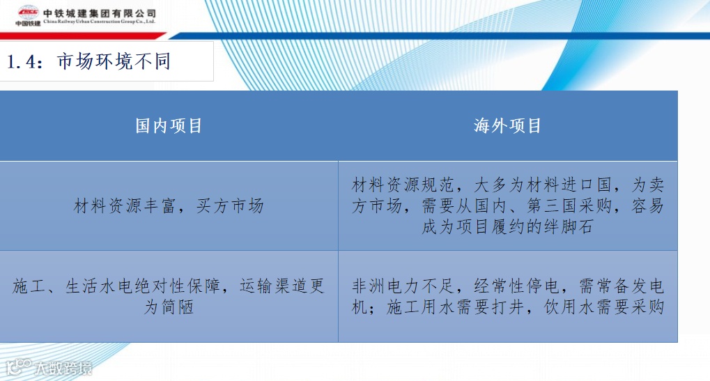 海外项目承包模式、管理模式、技术标准、市场环境、语言文化、自然环境、法律税收、项目风险均和国内有所不同,存在受制于平台公司、属地化管理落实力度不足、管理人才匮乏、体系不完整、制度不健全、团队商务能力薄弱等问题。要坚持市场布局不动摇、加强海外人才队伍建设、防范风险、降低成本、做好项目策划、树立正确的海外文化理念。海外项目收入高、环境优美、能增长见识、丰富阅历、成长迅速、氛围温馨。海外项目精彩纷呈,光彩夺目,不实践不足以体验个中苦乐,也享受不到其中的甘美,若干年后海外项目阅历将成为人生最难忘也最宝贵的财富。