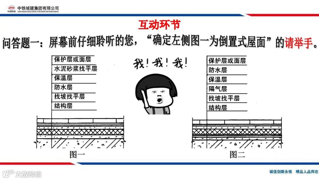 本次讲坛深入交流学习了屋面工程中有关屋面材料性能要求、防水等级划分、防水层最小厚度及安全规定等强制性条文。由于屋面工程作为工程创优检查的重点部位,交流中重点解读了屋面工程策划的原则及要点,将屋面工程重点关注的细部总结为“三线四根五口”关注点,便于大家理解和掌握。并按屋面分部工程中五个子分部工程的顺序,分别对工序的材料要求、工艺流程、操作要点、验收标准和注意事项等内容,逐一通过BIM动画模型、三维图例、CAD节点图、施工样板图片及整体效果图等多种方式演示,有效提高了青年技术人员的理解,加深了对应知识点的掌握,促进后续屋面工程施工中做到“保证功能、提高观感、创造亮点、铸造精品”综合管控打下坚实基础。