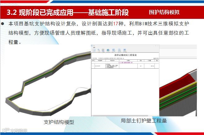 项目基坑支护结构设计复杂,设计剖面达到17种,利用BIM技术三维模拟支护结构模型,方便现场管理人员理解图纸,指导现场施工,并可出具任意部位的工程量。