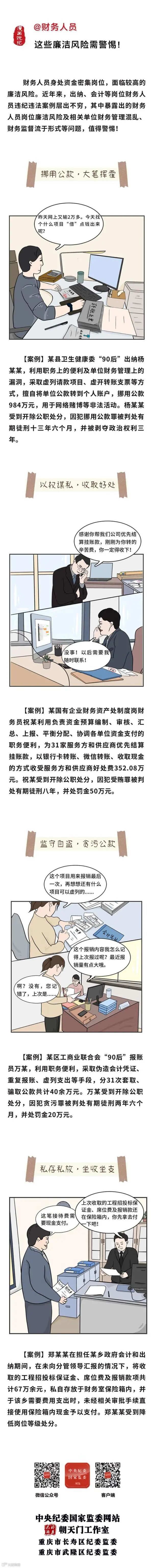 导读:财务人员身处资金密集岗位,面临较高的廉洁风险。近年来,出纳、会计等岗位财务人员违纪违法案例层出不穷,其中暴露出的财务人员岗位廉洁风险及相关单位财务管理混乱、财务监督流于形式等问题,值得警惕!