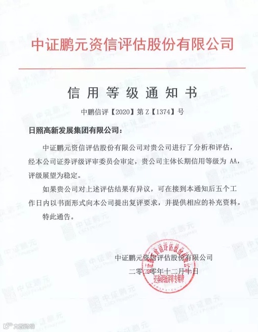 为进一步增加融资渠道,扩大资金来源,服务高新区高质量发展和集团项目建设,2020年7月,投融资部在高新区工委管委和集团党委各级领导的全力支持下,在集团各部室各单位的通力配合下,从联系审计机构到沟通外部评级机构,从梳理资产到整合资源,从报表审计到报告撰写,事不避难、事无巨细,连续5个月集体加班加点,克服重重困难,于12月10日成功斩获AA主体信用等级资质,为集团登陆资本市场进行企业债、公司债、PPN等直接融资拿到了宝贵的“准入证”,集团的发展和对外融资能力从此再迈一个新台阶。