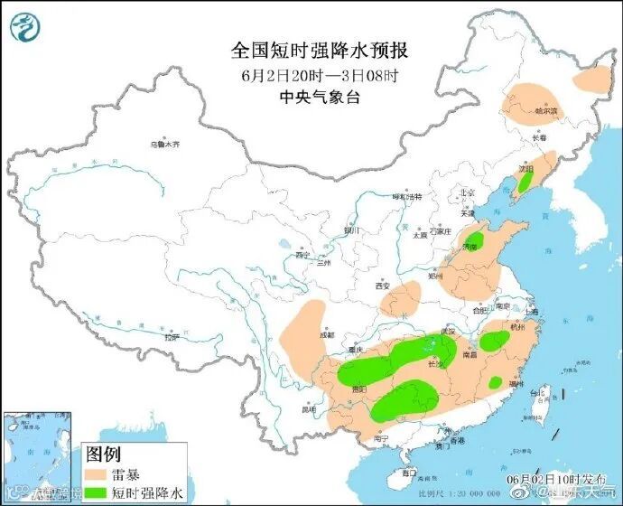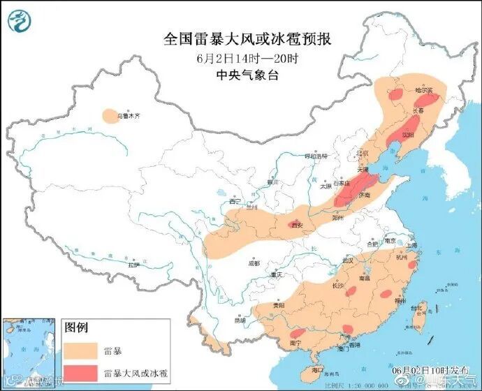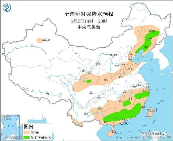 据中央气象台消息,6月2日14时至3日08时,黑龙江东南部、吉林、辽宁、山东中北部、湖北东部和南部、湖南北部和西南部、江西中北部和南部、浙江中南部、福建东南部和西北部、贵州中北部、广西东部、广东等地的部分地区将有短时强降水天气,小时雨强20-50毫米,局地可达70毫米以上;另外,黑龙江东南部、吉林中东部和西部、辽宁中北部和西部、陕西中部、河北南部、山东北部和南部、河南北部、安徽北部、湖北东部、湖南、江西中部、浙江中部、福建西北部、贵州东北部和中部、广西东部、广东中部等地的局地将有雷暴大风或冰雹天气。