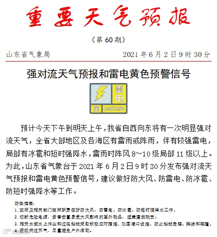 山东省气象局今天9时30分发布重要天气预报:今天下午到明天上午,山东自西向东将有一次明显强对流天气,全省大部地区及各海区有雷雨或阵雨,伴有较强雷电,局部有冰雹和短时强降水,雷雨时阵风8~10级局部11级以上。为此,山东省气象台于2021年6月2日9时30分发布强对流天气预报和雷电黄色预警信号,建议做好防大风、防雷电、防冰雹、防短时强降水等工作。