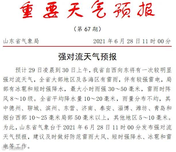 预计29日凌晨到30日上午,山东自西向东将有一次较明显强对流天气,全省大部地区及各海区有雷雨,伴有较强雷电,局部有冰雹和短时强降水,最大小时雨强30~50毫米,雷雨时阵风8~10级。全省平均降水量10~20毫米,雨量分布不均,其中德州、聊城、滨州、东营、济南、泰安、淄博、潍坊、青岛和烟台西部10~25毫米局部50毫米以上,其他地区5~10毫米。为此,今天11时山东省气象台发布强对流天气预报。