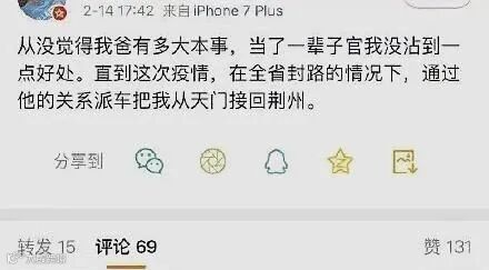 比如今年2月的“大意失荆州”事件。2月14日,湖北一名男子发微博炫耀,说在湖北全省封路的情况下,自己通过“当官的”父亲关系从天门回到荆州。没想到有关部门连夜调查,第二天,那位“大意失荆州”的父亲就被宣布停职。