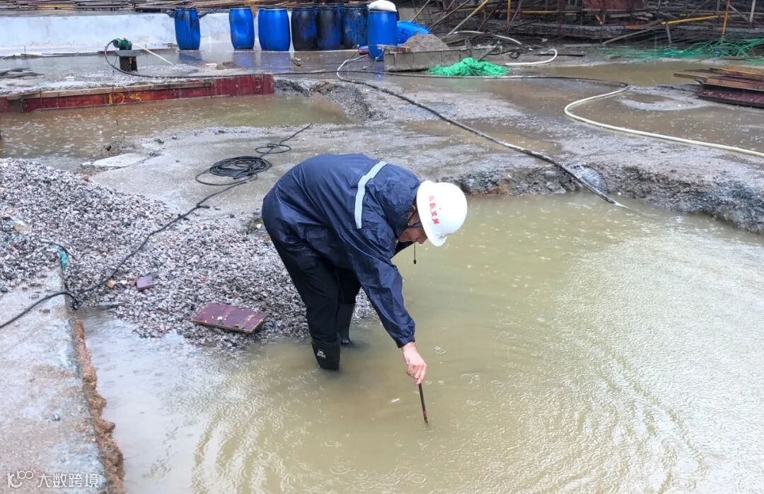 降雨过后气温略有下降,早上6点,因为担心昨晚的降水会导致基坑积水、脚手架泡水的施工安全员卢立福已经早早到达施工现场。戴上安全帽,穿上雨鞋,进入施工现场进行安全检查,这就是一个安全员上班的第一件事。