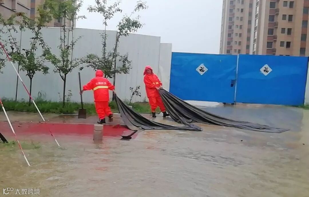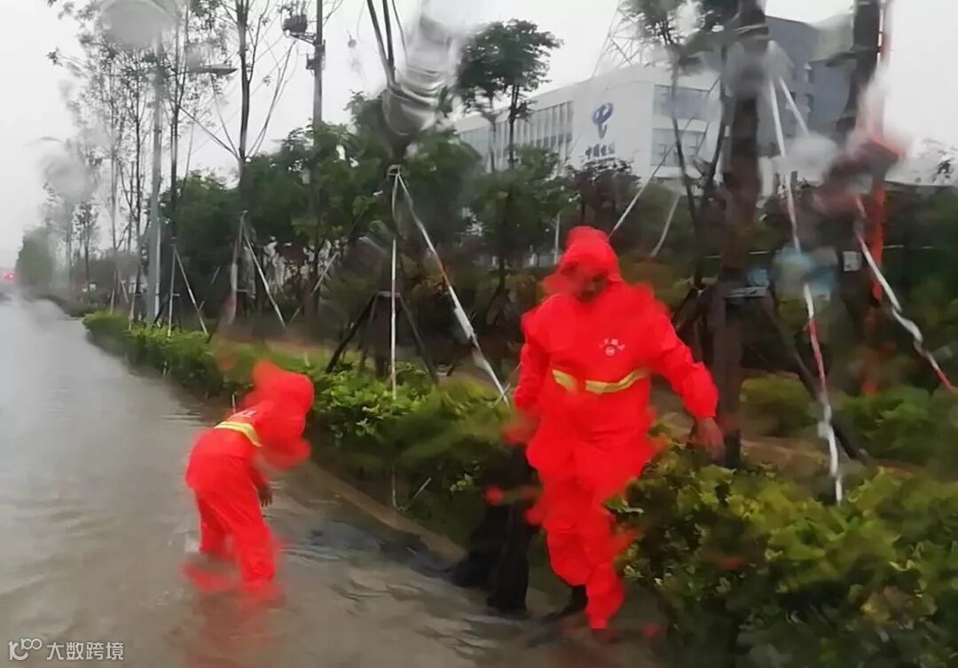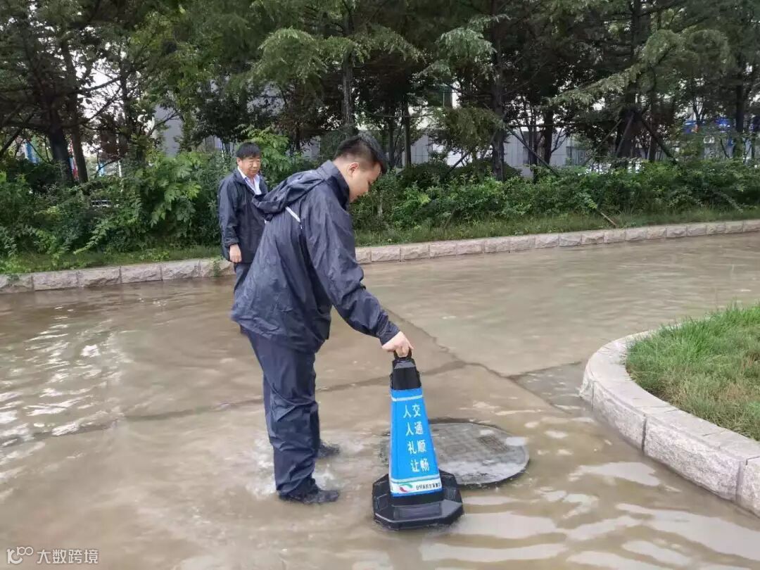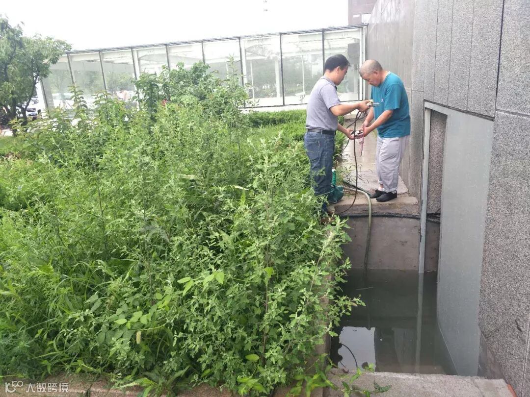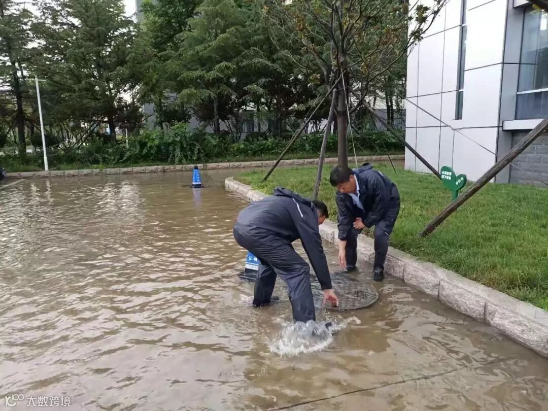 日照高投园区运营公司迅速组织物业管理人员冒雨对园区各下水管道积水进行反复查看,疏通排水管道。